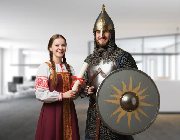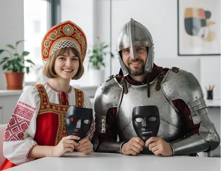 Объявите конкурс сказочных образов: шлемы из фольги, бороды из ваты, плащи, картонные мечи. Заранее подготовьте примеры образов и разошлите их богатырям в виде шуточных свитков-вдохновений. За день до праздника организуйте «мастерскую героев» — стол с материалами, где можно потренироваться и собрать заготовки. В день мероприятия помогайте дружине довести образы до совершенства — закрепить детали и добавить финальные штрихи!