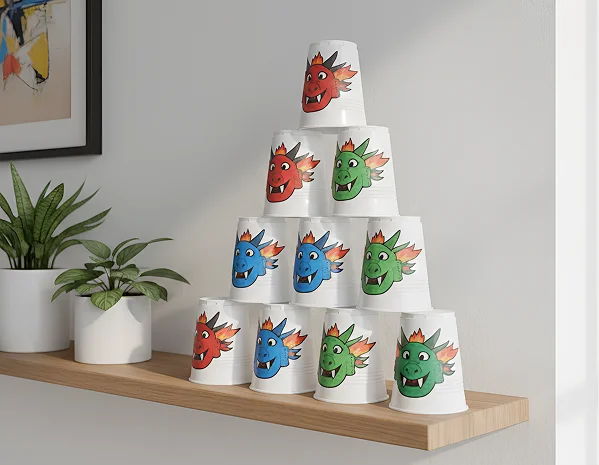Шуточный тир: стаканчики с головами Змея и пинг-понговые мячи. Попадание — комплимент, угощение или частушка во славу.